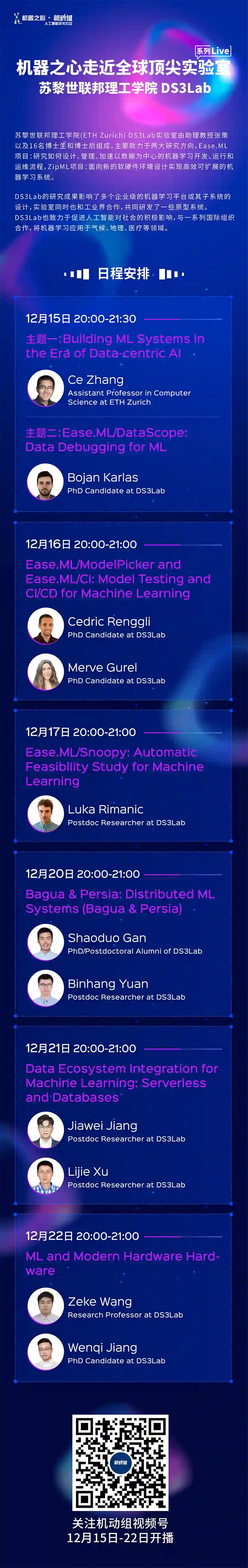 ,来自苏黎世联邦理工学院DS3Lab实验室的11位嘉宾将带来6期分享:构建以数据为中心的机器学习系统,详情如下: