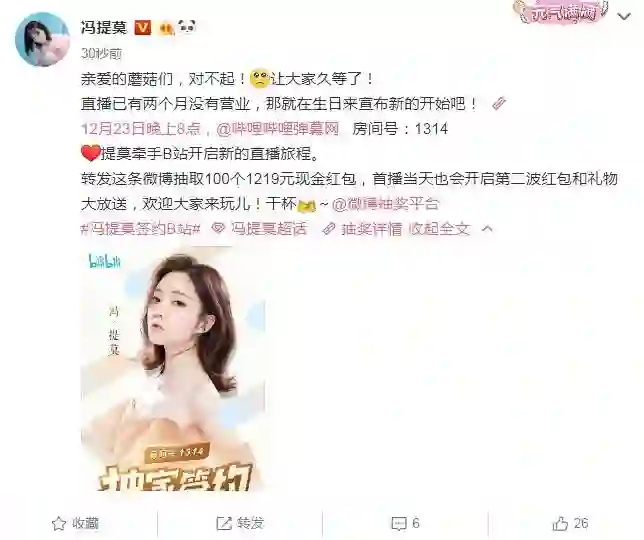 同时冯提莫在微博上去掉了陪伴自己多年的“主播”标签,换成了“歌手”;