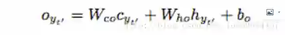 第一个部分表示attention context vector对decoder输出的影响,由于context是从input计算得来的,可以理解为encoder的每个输入对decoder输出的影响;第二个部分表示decoder当前隐藏层最后一层对输出的影响;第三个部分表示偏置项。