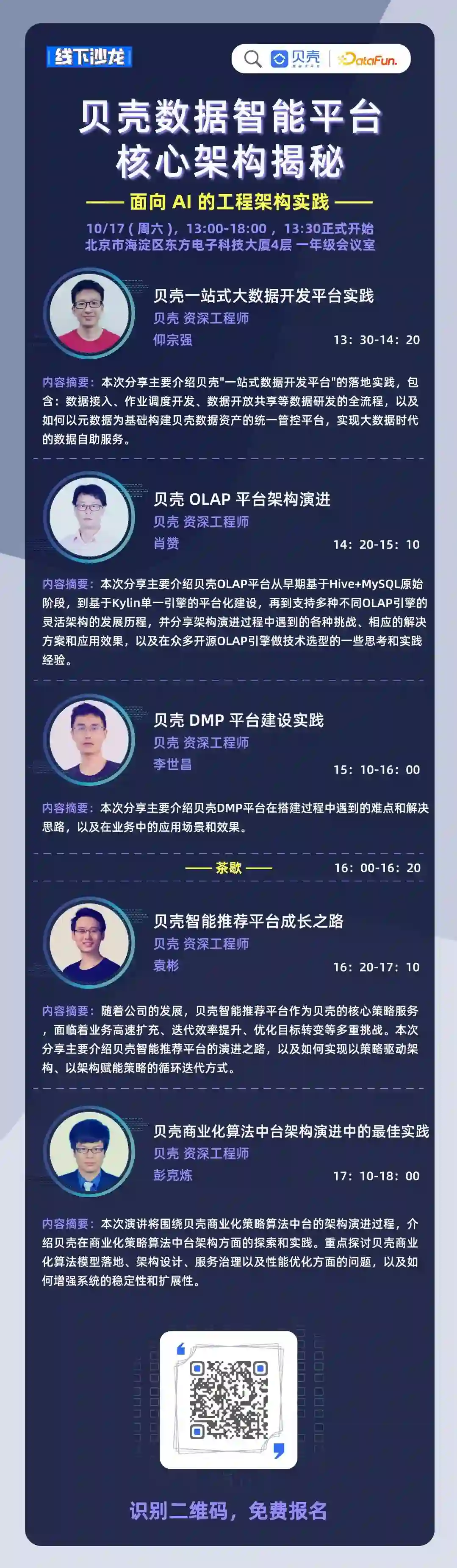 10月17日,13:00-18:00(13:30正式开始),由DataFunTalk联合贝壳数据智能中心主办的贝壳数据智能平台核心架构揭秘将邀请来自贝壳的五位嘉宾,来到贝壳北京办公区进行线下分享。