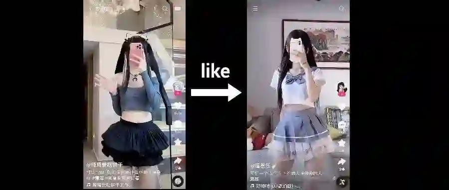 为了测试其效果,我顺便下载了一下快手这款app,于是就出现了下图的场景:左图是用户冷启动推给我的第一个短视频,一个穿着短裙的小姐姐,紧接着第二个短视频就是右图的另一位小姐姐,而后面的几个短视频也出现了电影、美食等其它方向,探索和利用(Exploit&Explore)做得都很不错,大家可以去快手上体验一下。