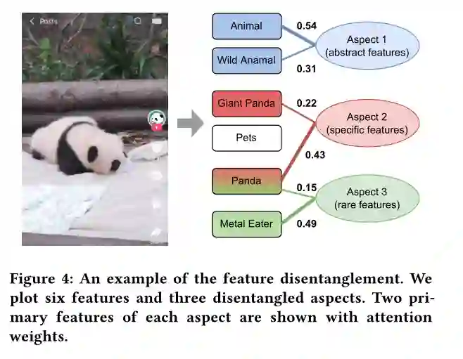 从图中,我们可以看到,视频的特征根据语义的不同被分解为了不同方面,第一个方面侧重于抽象特征,如“动物”和“野生动物”;第二个方面捕捉了更加细粒度的信息,如“大熊猫”和“熊猫”;第三个方面则提取了一些不寻常的特征,如图中的“Metal Eater”为“吞金兽”,是熊猫的昵称。还有一个”pets“是视频中的多余标签,并没有被所有的方面捕捉到。