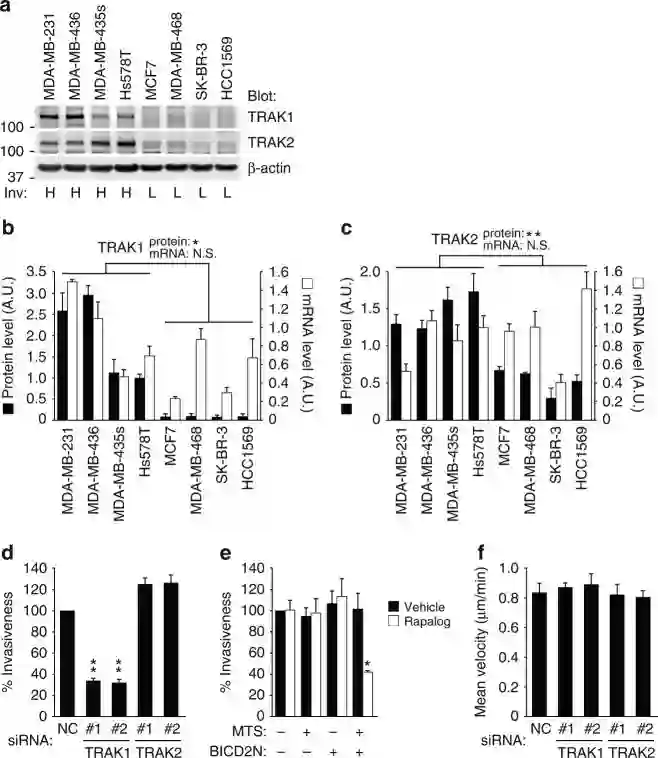 F. 但是TRAK1和TRAK2均不会影响细胞在胶原蛋白表面的随机迁移速度。这些结果表明,TRAK1介导的线粒体顺向运输有助于肿瘤细胞侵袭。