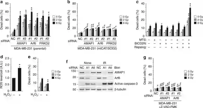 G. 泛Caspase抑制剂Z-VAD-FMK处理后,Arf6-AMAP1通路对电离辐射敏感性的影响降低。这些结果表明线粒体聚集引起ROS增加,是通过活化Caspase3凋亡途径实现细胞死亡。