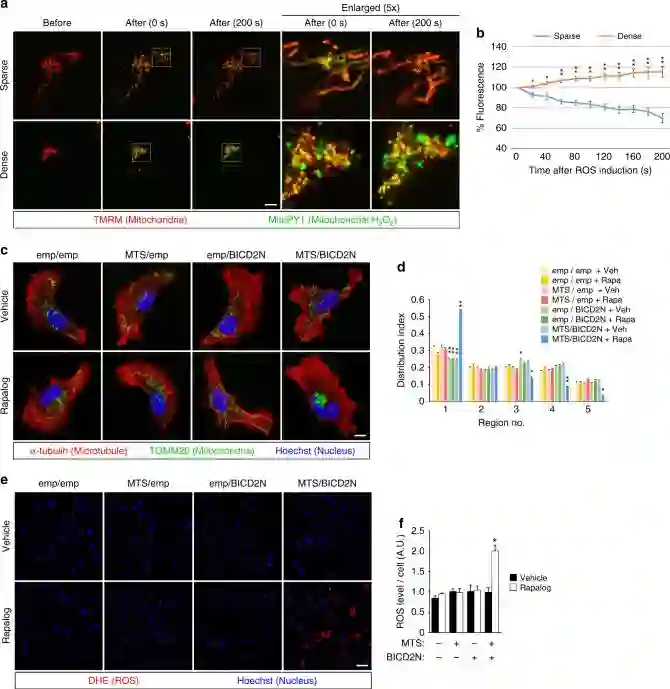 C. D. 研究人员开发了一个系统,将MTS-FKBP和BICD2N-FRB*分别锚定在线粒体膜上,用雷帕霉素类似物(Rapalog)可以诱导这二者的结合,使线粒体(绿色)聚集。