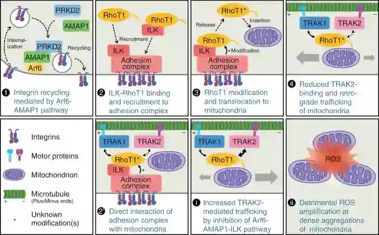 侵袭性肿瘤细胞中Arf6-AMAP1途径介导的整合素循环对于成熟粘合斑FA的形成是必需的(1)。在FAs(2)处形成或募集的ILK-RhoT1复合物可能与粘附复合物的一些其他组分相互作用,这导致RhoT1的分子特性的改变。修饰的RhoT1被释放出来并嵌入线粒体外膜(3),并负向调节RhoT1和TRAK2之间的相互作用,导致线粒体的顺向运输相对增加(4)。另一种可能性是锚定在线粒体外膜上的RhoT1可能与ILK相互作用,ILK弥散于细胞质中,当线粒体之间相互靠近聚集时,可能发生上述修饰(2')。这些机制的破坏降低了侵袭性并增强了RhoT1和TRAK2之间的分子相互作用,RhoT1和TRAK2优先介导线粒体逆行运输(i)。由此引起的线粒体聚集导致ROS扩增(ii)。