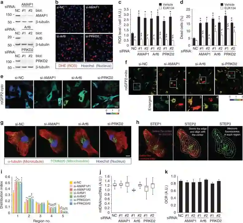 J.K. 但是,用siRNA阻断Arf6-AMAP1通路后,线粒体内的DNA量以及线粒体的呼吸量OCR值均未受到影响,表明Arf6-AMAP1信号对ROS的调节不是通过影响线粒体本身实现,而是影响的线粒体的迁移。