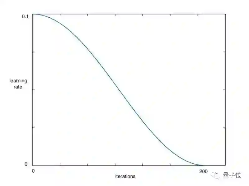 从上图可以看出,随着x的增加,余弦值首先缓慢下降,然后加速下降,再次缓慢下降。这种下降模式能和学习率配合,以一种十分有效的计算方式来产生很好的效果。