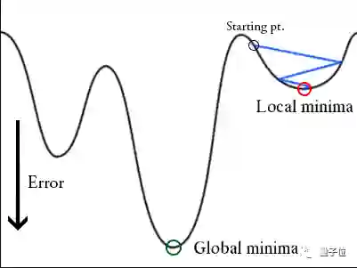 在训练时,梯度下降算法可能陷入局部最小值,而不是全局最小值。