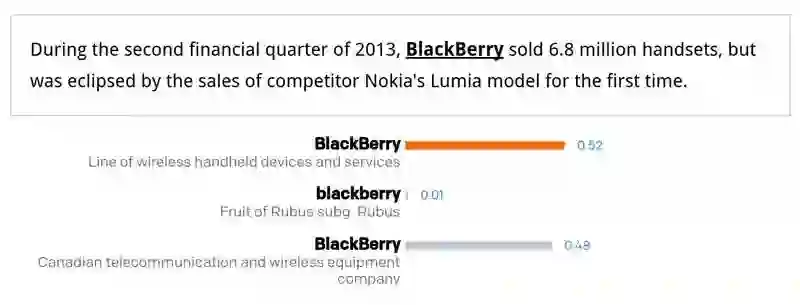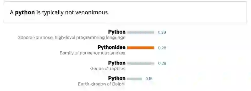 在测试阶段,给定一个词语以及其上下文,我们的神经网络将输出该词语属于其类型系统中每一个类别的概率。如果我们知道了类别成员的准确集合,我们可以将结果缩小到一个实体 (假设分类结果是完美的)。但实际上,我们必须计算大概 20 个概率问题:对于该单词的每一个可能对应的实体,都需要使用贝叶斯理论来计算其概率。