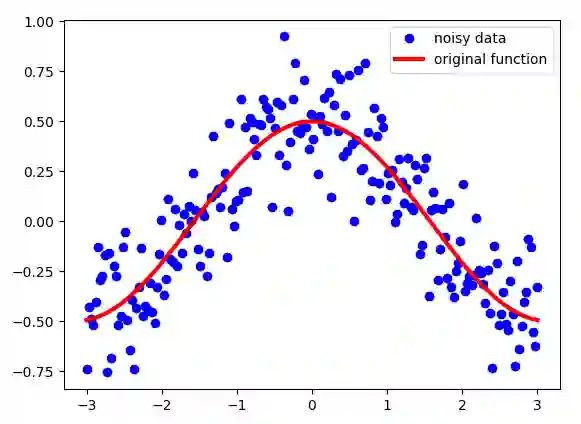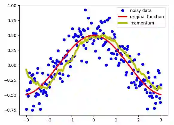 我们需要处理这些数据,而非直接使用它们。我们需要某种「移动」的平均值,这个平均值会使数据「去噪」从而使其更接近原始函数。指数加权平均值可以产生如下所示的图片: