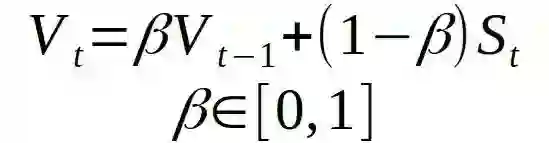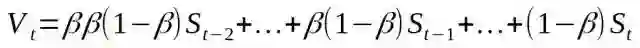 从这个等式中可以看出,新序列的第 T 个值取决于原始序列 S 的所有先前的数值 1…t。来自 S 的所有数值被赋了一定的权重。这个权重是序列 S 的第(t-i)个值乘以(1- beta)得到的权重。因为 Beta 小于 1,所以当我们对某个正数的幂取 beta 时,值会变得更小。所以序列 S 的原始值的权重会小得多,也因此序列 S 对序列 V 产生的点积影响较小。