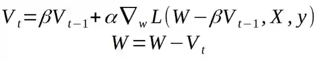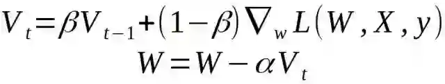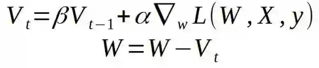 式中 L 是损失函数,三角形符号是梯度 w.r.t 权重,α 是学习率。另一种最流行的表达动量更新规则的方式不那么直观,只是省略了(1 - beta)项。