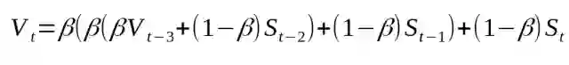 让我们对指数加权平均新序列 V 的三个连续元素的定义进行扩展。