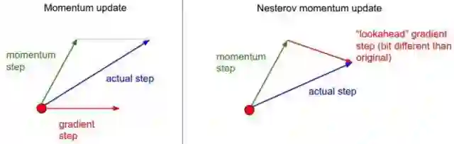 Nesterov 动量是一个版本略有不同的动量更新,最近越来越受欢迎。在这个版本中,首先会得到一个当前动量指向的点,然后从这个点计算梯度。如下图所示: