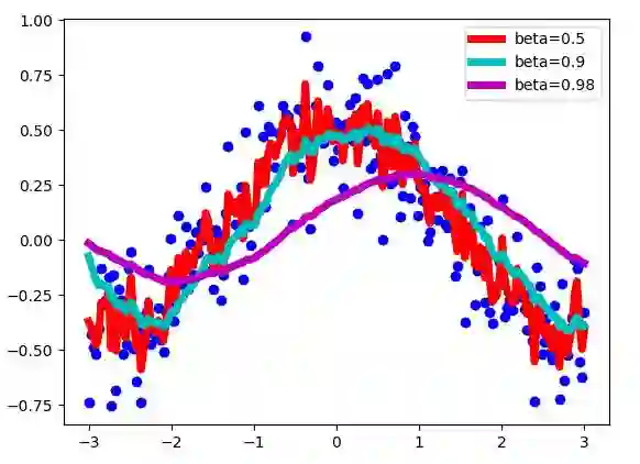 序列 V 是上面的散点图中的黄色部分。Beta 是取值为 0 到 1 的另一个超参数。在上述例子中,取 Beta = 0.9。0.9 是一个很好的值,经常用于具有动量的 SGD 方法。我们可以这样对 Beta 进行直观理解:我们对序列后面的 1 /(1- beta)的点进行近似平均。让我们看看 beta 的选择会对新序列 V 产生怎样的影响。
