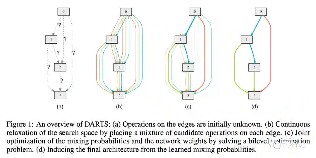 Darts则不然,Darts,是Differentiable Architeture Search的缩写。在Darts中,网络结构的确定是可微的,即可以把梯度传递下去的,这样,就使得网络结构的学习跟网络结构对应参数的学习在一起了。其实,在读了下文中的算法细节后,大家会发现,Darts也做到了不同结构间的参数共享。