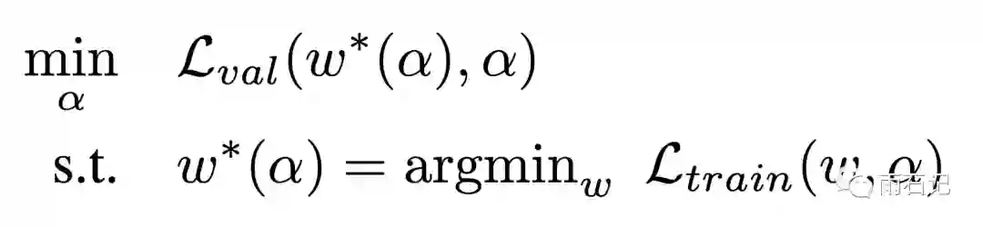 在这样的方法下,有两类参数,一类是与操作相关的参数,比如各种卷积操作等,一类是与边选择相关的参数,即计算边的概率的alpha,因而,我们的问题就变成了: