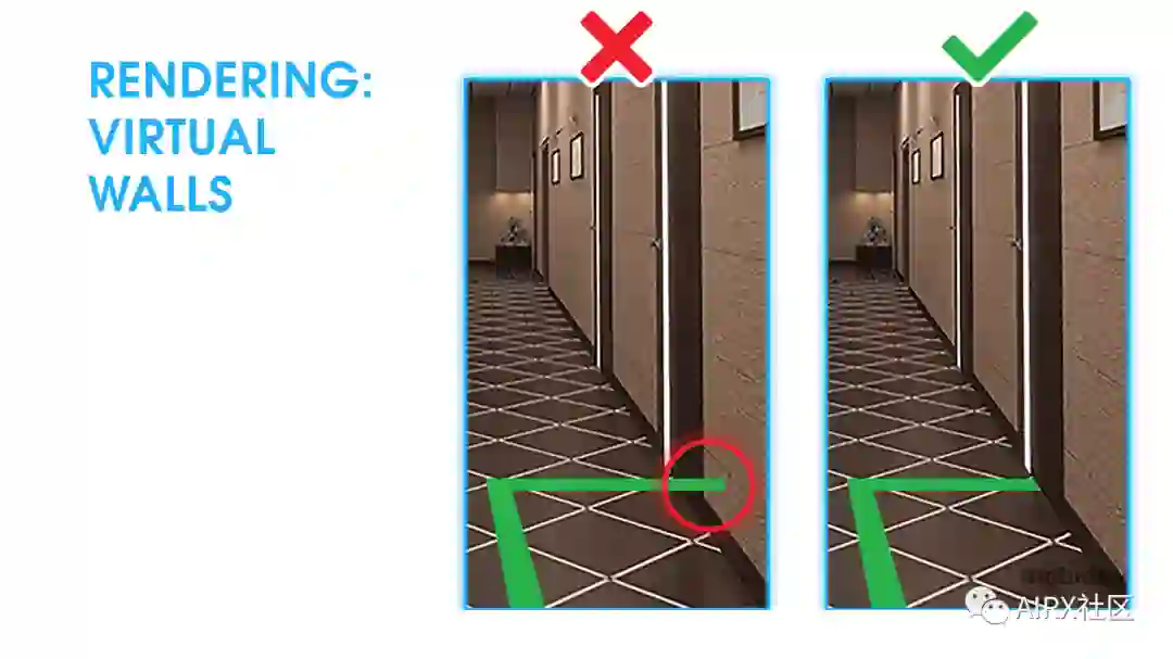 然后,我们使用图论构建路线,并根据坐标绘制折线或箭头(根据设计要求)。但是,使用增强现实在现实世界中绘制路线时会遇到一些挑战。事实是,AR内容始终放置在摄像机图像的顶部,从而产生了将数字内容放置在现实世界中的幻觉。如果绘制了整个路线,它将看起来很奇怪,直接穿过墙壁绘制。