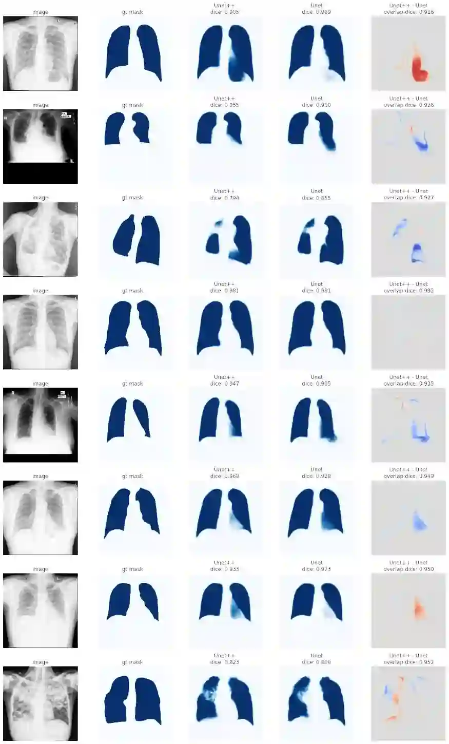 这些是非常大的图像,通常是2000×2000像素,有很大的mask,从视觉上看,找到肺不是问题。使用segmentation_models_pytorch库,我们为Unet和Unet++使用100+个不同的预训练编码器。我们做了一个快速的pipeline来训练模型,使用Catalyst (pytorch的另一个库,这可以帮助你训练模型,而不必编写很多无聊的代码)和Albumentations(帮助你应用不同的图像转换)。