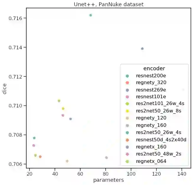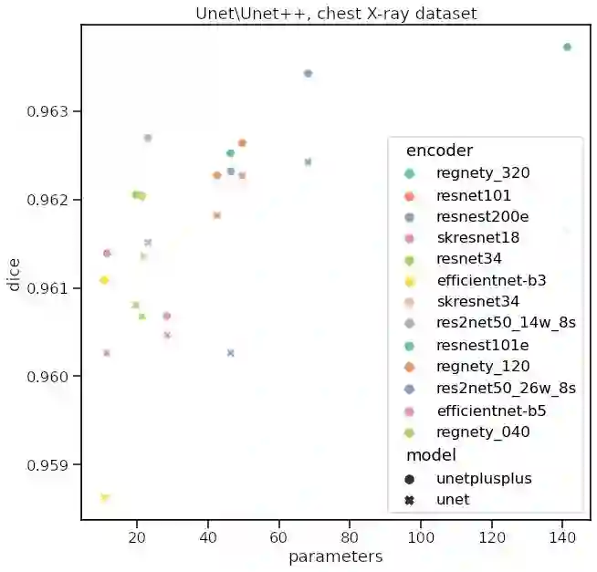 我们注意到的第一件事是,在所有编码器中,Unet++的性能似乎都比Unet好。当然,有时这种差异并不是很大,我们不能说它们在统计上是否完全不同 —— 我们需要在多个folds上训练,看看分数分布,单点不能证明任何事情。第二,resnest200e显示了最高的质量,同时仍然有合理的参数数量。有趣的是,如果我们看看https://paperswithcode.com/task/semantic-segmentation,我们会发现resnest200在一些基准测试中也是SOTA。