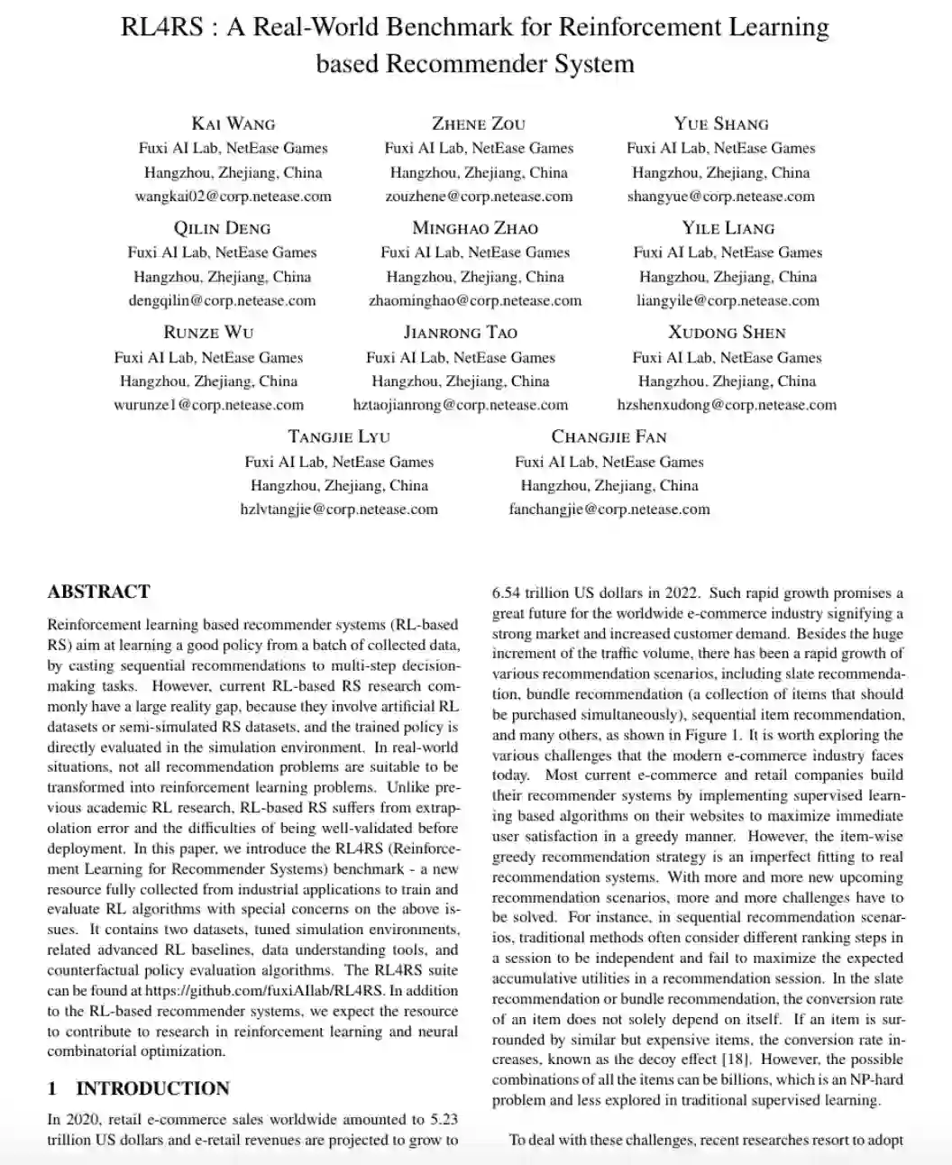 近日,由网易伏羲研究团队和伏羲TTG技术团队联合发布的强化学习推荐系统工业数据集RL4RS,正式在Github开源社区开放下载。在之前的2021年年中,该工作曾与IEEE BigData 2021大会合办了网易伏羲第一届大数据竞赛,IEEE BigData Cup 2021: RL-based RecSys,吸引了国内外高校近百支队伍的参赛以及多达7篇的参赛中稿论文,并在大会上成功举办了主题WorkShop。