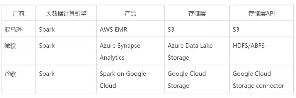 在现实的企业应用中,无状态的计算端可以容易的做到在多云之间进行迁移。而对于有状态的存储端,想要做到灵活可迁移却并不容易,而且它们的管理面、数据面的 API 也各不相同。AWS、Azure 和 Google 都提供了基于 Spark 大数据平台方案,但是在存储层,则基于自家的存储产品给出了不同的方案: