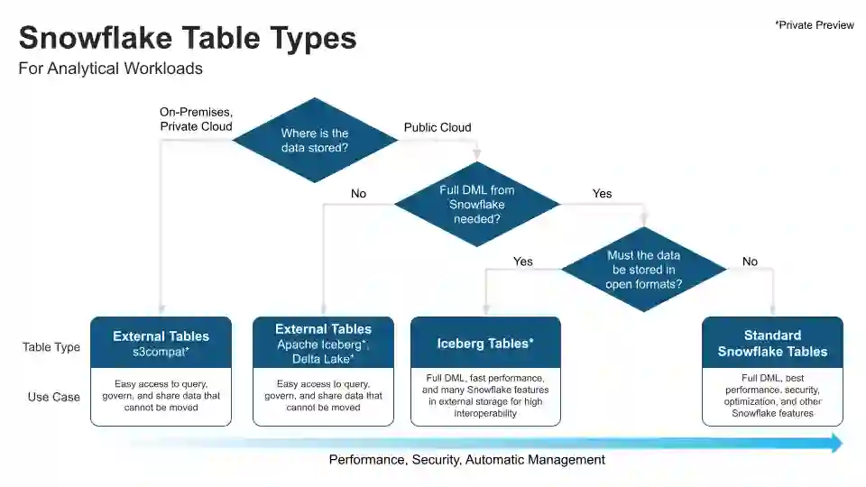 然而仅仅在公有云上支持数据共享并不能悉数满足企业的要求,一个不可忽视的现实是企业有许多业务和数据必须保留在自有或私有云上。因此在今年的 Snowflake Summit 上,Snowflake 宣布了将在未来把对外部表的支持扩展至任何 S3 标准兼容的私有云存储服务上。用户能够将私有云以及公有云上无法迁移的数据引用至 Snowflake,并能和已导入 Snowflake 的数据共同分析。