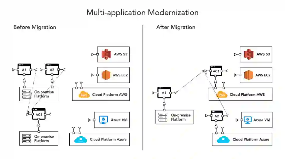 企业在向云数字化转型过程中通常有几种典型的架构,比如,在《6 Multi-Cloud Architecture Designs for an Effective Cloud Strategy》 一文中,以作者提到的较为复杂的应用程序现代化为例,他建议将多应用云原生化,作为一个组合部署到多云,如下图所示: