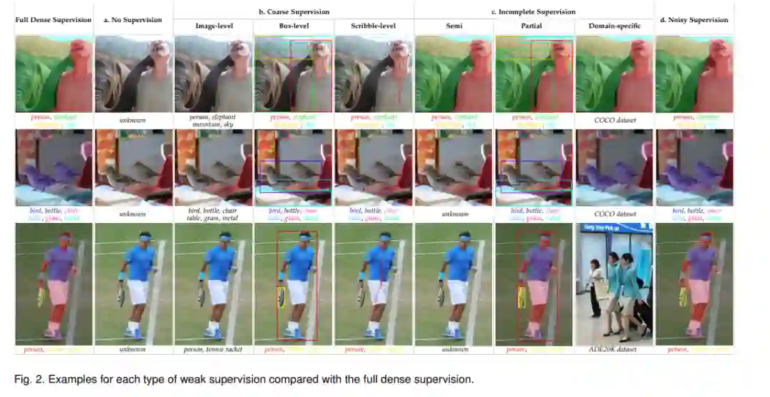 本文旨在对近年来标签高效的深度分割方法进行全面的综述。这些方法关注不同的问题。这里,一个问题被定义为一个特定的分割问题,即语义分割、实例分割和全景分割,具有某种类型的弱监督。为了将这些方法组织起来解决各种各样的问题,我们需要解决两个问题:1)如何建立这些方法的分类?2)如何从统一的角度总结这些方法所使用的策略?我们注意到,弱标记的类型是设计高效标记分割方法的关键。因此,我们试图从监管薄弱的角度来回答上述两个问题。为此,我们首先给出弱监督的类型分类,它是层次化的,如图1所示。弱监督包括的类型: