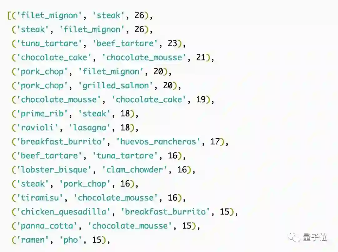 混淆矩阵显示,以下类别的食物经常被错误分类: