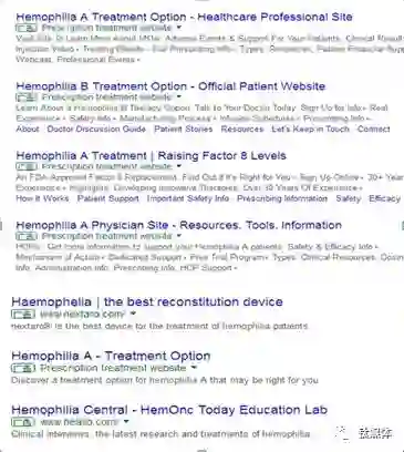 但这也分不同的疾病,有的例如“血友病”关键词下就能看到大量广告,在美国网络环境下通过PC浏览器搜索“hemophilia”,和在中国台湾搜索“月子中心”类似,会出现6-7条结果,其中一半以上都直接提供治疗方案。看来谷歌的疾病广告确实是区别对待的。