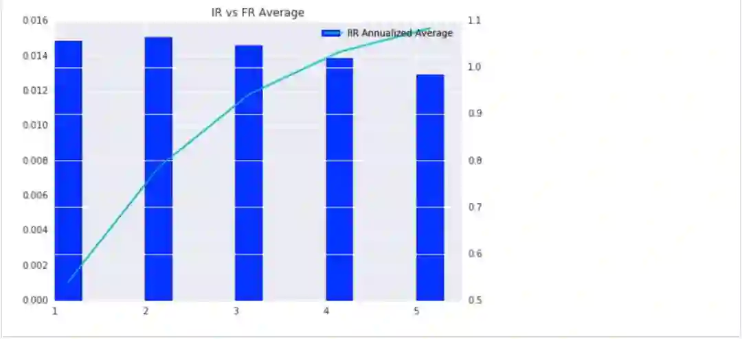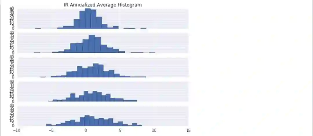 "IR Annualized Average Histogram"五张子图表示,T+1~T+5调仓的因子平均年化收益IR分布图(反映收益稳定性),横坐标为收益的IR,纵坐标为个数。