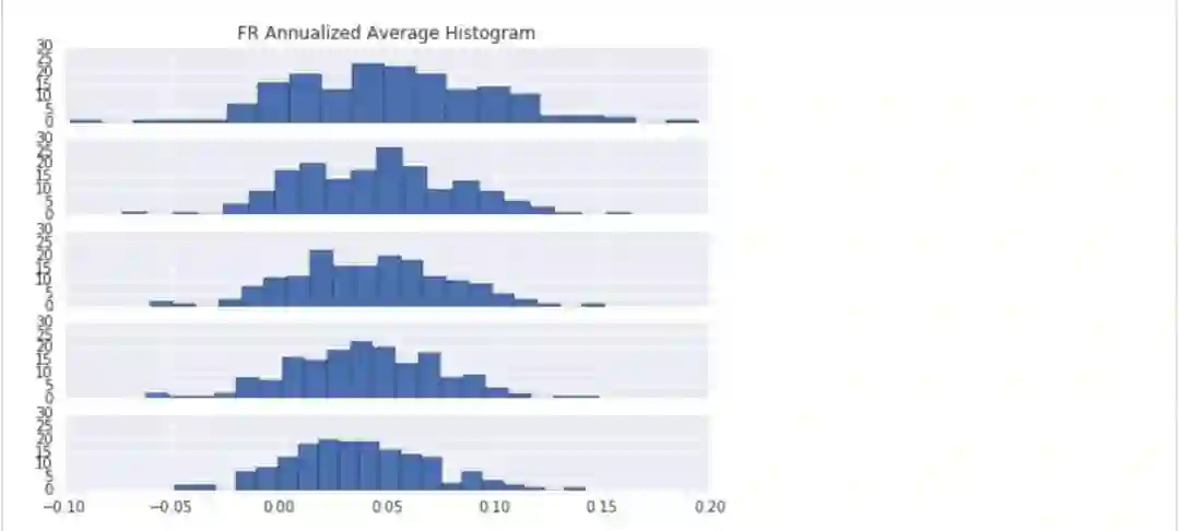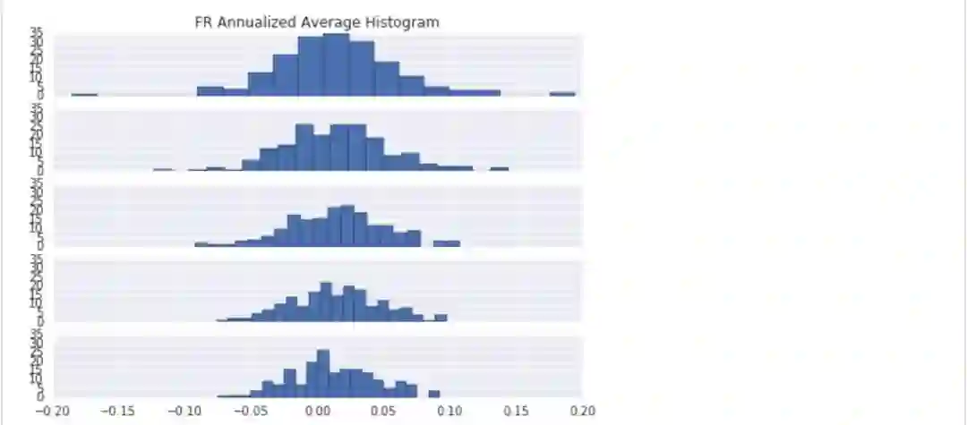 "FR Annualized Average Histogram"五张子图表示,T+1~T+5调仓的因子平均年化收益分布图,横坐标为收益值,纵坐标为个数;