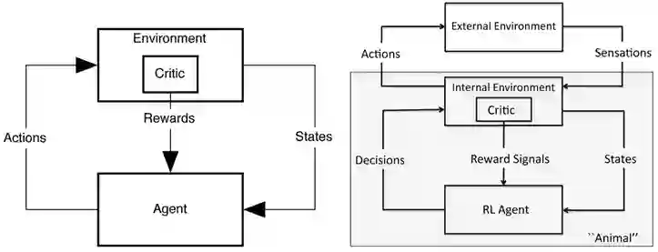……强化学习智能体并不一定是一个完整的生物或机器人,它可以是一个更大的行为系统的一部分。这意味着收益信号可能被更大的行动智能体内部的事情所影响,例如动机、记忆、想法甚至幻觉。收益信号可能也依赖于学习过程本身的一些性质,比如衡量学习中进步了多少。让收益信号对这样的内部信息敏感,可以使智能体作为“认知架构”的一部分,学习如何控制认知架构,同时也可以获取一些特定的知识和技能,这些技能很难只依赖于外部的收益信号学习到。这种可能性导致了“内在激励的强化学习”这个思想……