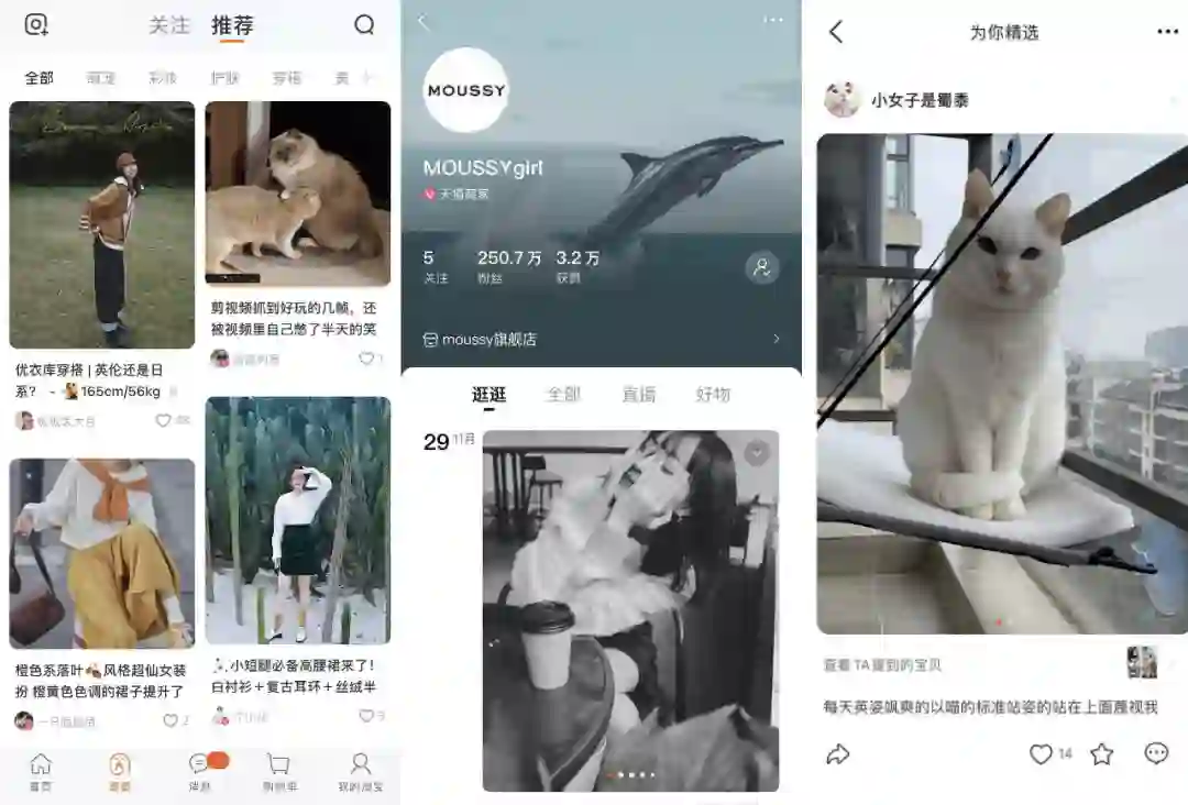 目前逛逛分为“关注”和“推荐”两个板块。关注页面信息流与朋友圈等社交媒体类似,用户可以浏览和查看其已关注的达人、商家和品牌号,建立“人格化”的关系。点开头像,还能查看商家号和达人号的主页内容,查看该号的粉丝、点赞、关注等数据,并进入“直播”、“好物”等页面。