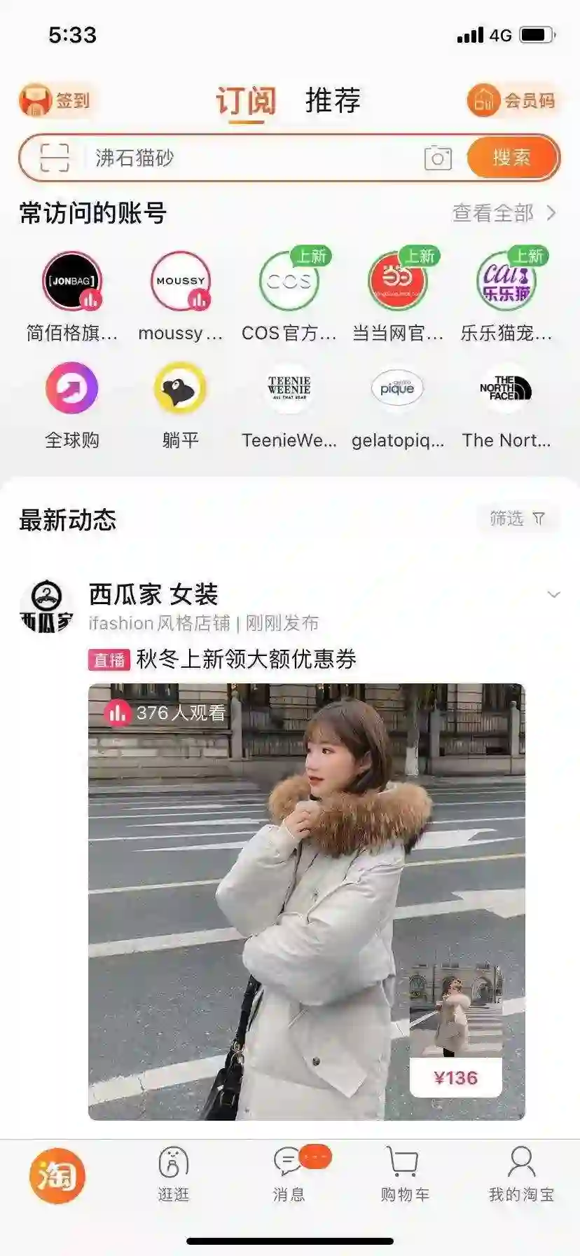 1、“微淘”改名为订阅,在首页上方新增了一个tab,与“推荐”并列;