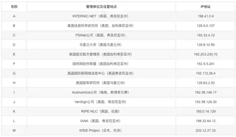 全球的DNS根服务器(IPV4)共有13个,主要分布在美国。除此之外,英国、瑞典、日本各有一个