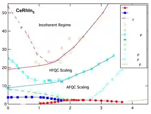 图2:重费米子材料CeRhIn5的压力-温度相图及其各种实验所给出的特征温度,其中HYQC代表杂化量子临界区,AFQC代表反铁磁量子临界区