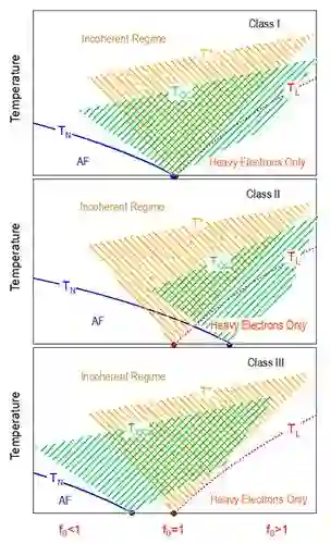 图3:三类重费米子材料、两类量子临界点及其相应的量子临界涨落示意图。其中f0表征杂化强度,T*为相干温度,TQC为磁性量子临界区的上边界,阴影示意两类不同的量子涨落,TL之下f电子完全巡游。