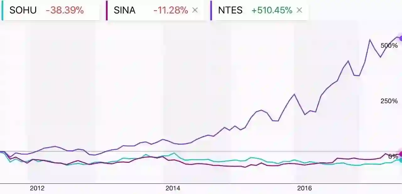 过去6年老三大门户搜狐(SOHU)、新浪(SINA)和网易(NTES)股价对比