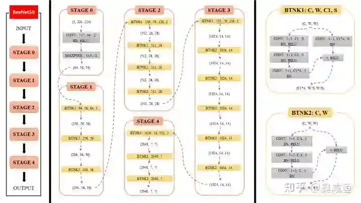 如本图所示,输入INPUT经过ResNet50的5个阶段(Stage 0、Stage 1、……)得到输出OUTPUT。