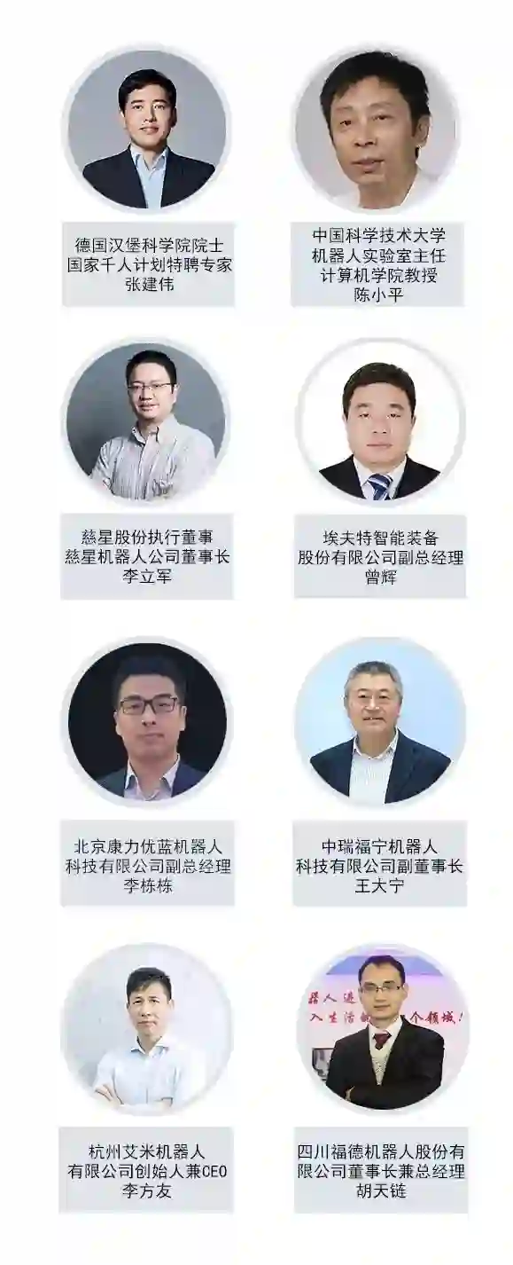 德国汉堡科学院院士、国家千人计划特聘专家张建伟,中国科学技术大学机器人实验室主任、计算机学院教授陈小平,宁波慈星机器人技术有限公司董事长李立军,埃夫特智能装备股份有限公司副总经理曾辉,中瑞福宁机器人科技有限公司副董事长王大宁,四川福德机器人股份有限公司董事长兼总经理胡天链,杭州艾米机器人有限公司CEO李方友,北京康力优蓝机器人科技有限公司副总经理李栋栋等近60位机器人行业知名专家和细分方向龙头企业领导将应邀出席。