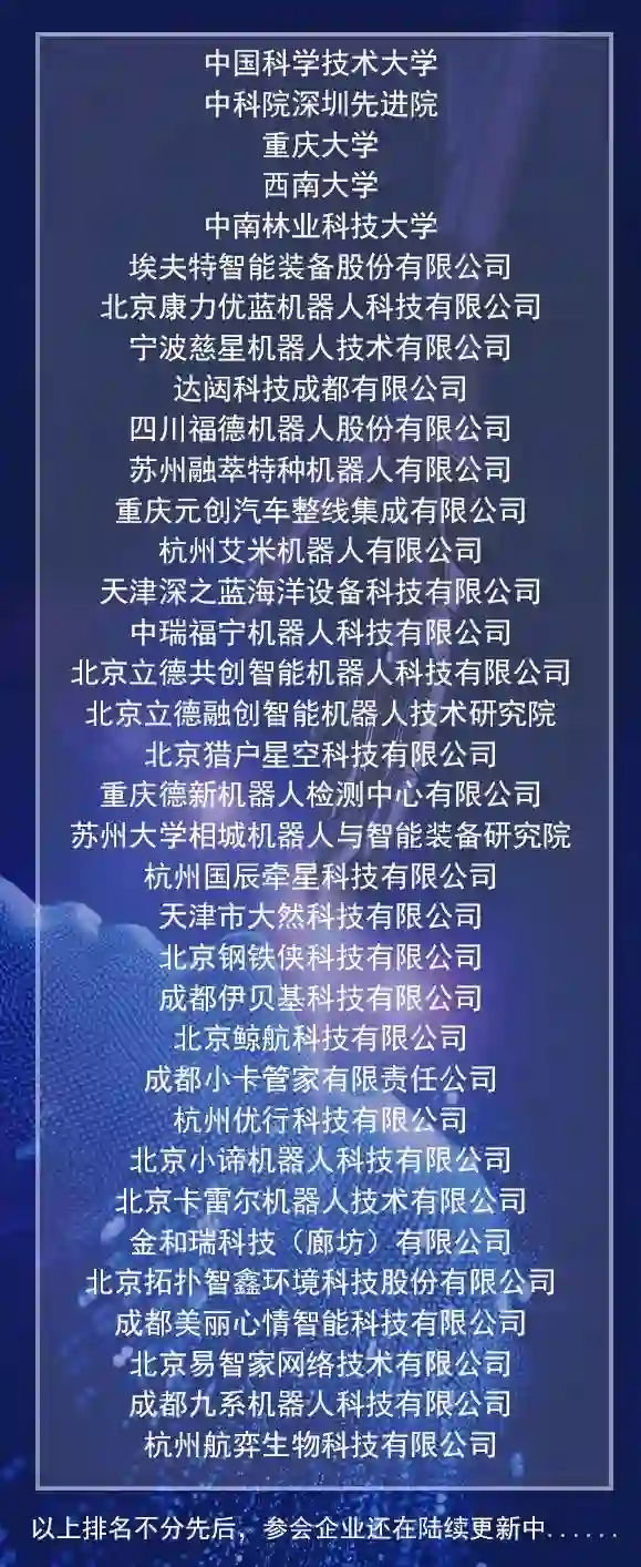 会议邀请到了近50家机器人和人工智能领域的龙头企业和新锐企业,包括工业机器人龙头企业埃夫特、服务机器人龙头企业康力优蓝、机器人细分领域先进企业达闼科技、重庆元创、杭州艾米机器人等,涵盖了工业机器人、服务机器人和特种机器人领域的众多方向,以及人工智能领域的若干重大方向。