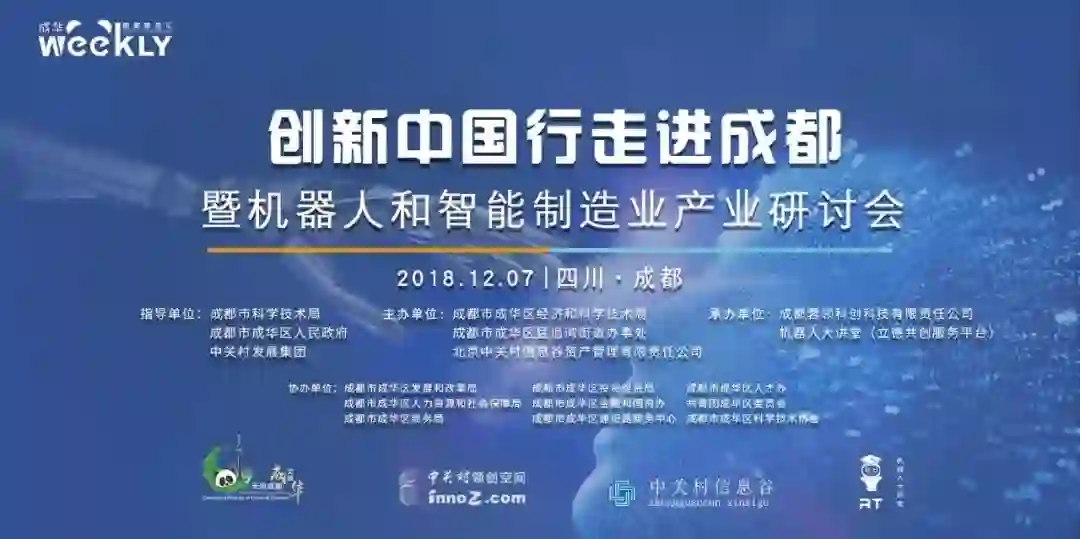由成都市科学技术局、成都市成华区人民政府和中关村发展集团为指导单位,成都市成华区经济和科学技术局、成都市成华区猛追湾街道办事处和北京中关村信息谷资产管理有限责任公司主办,成都蓉领科创科技有限责任公司、机器人大讲堂(立德共创服务平台)承办,成都市成华区发展和改革局、成都市成华区人力资源和社会保障局、成都市成华区商务局、成都市成华区投资促进局、成都市成华区金融和国资办、成都市成华区建设路商务中心、成都市成华区人才办、共青团成华区委员会、成都市成华区科学技术协会协办的周周菁蓉汇双创系列活动之创新中国行走进成都暨机器人和智能制造产业研讨会将于12月7日于四川省成都市盛大召开。