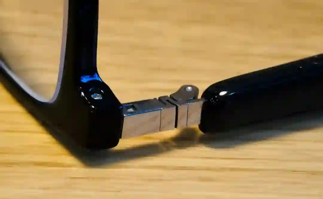 镜腿和前框是可拆卸设计,全球独创的模块化拆卸设计,稍微用力拔下来就可以替换前框,插上去也非常稳固。值得一提的是这个弹弓铰链的设计,可以得到 8 度的外扩,适合不同的头围宽度。