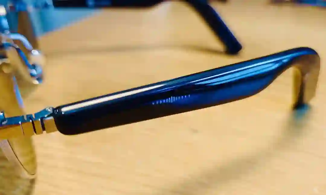 主要部件其实是镜腿部分,跟我之前试戴的同类产品大小差不多,区别是每侧有两个发声孔,一个耳前,一个耳后,据说是首创的单侧双喇叭设计,采用开放式环绕音系统,后面会体验。