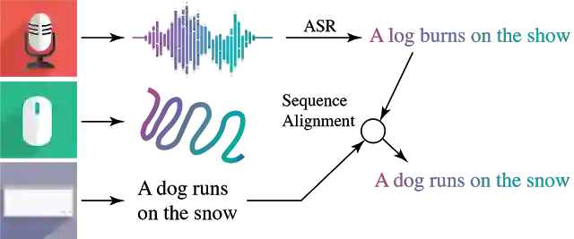 局部叙事由标注者手工添加,在原本的文字描述上新增语音标注 (转录)与移动鼠标轨迹标记所描述的区域。语音标注是此方法的核心,直接将描述内容与所指的图像区域对应联系。为了让标注更易于理解,标注者转录了他们所进行的描述,并将自动语音转录结果对齐。这一过程恢复了语音描述的时间戳,从而确保三种标注形式(语音、文本和鼠标轨迹)正确且保持同步(见下图)。