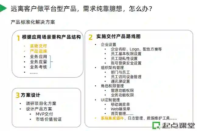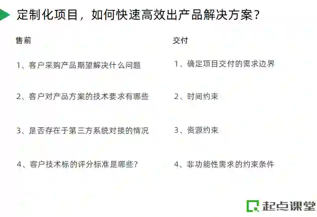 这个部分,老师将通过售前和交付2个维度量进行问题剖析,并分享一套定制化产品解决方案快速产出4步法。