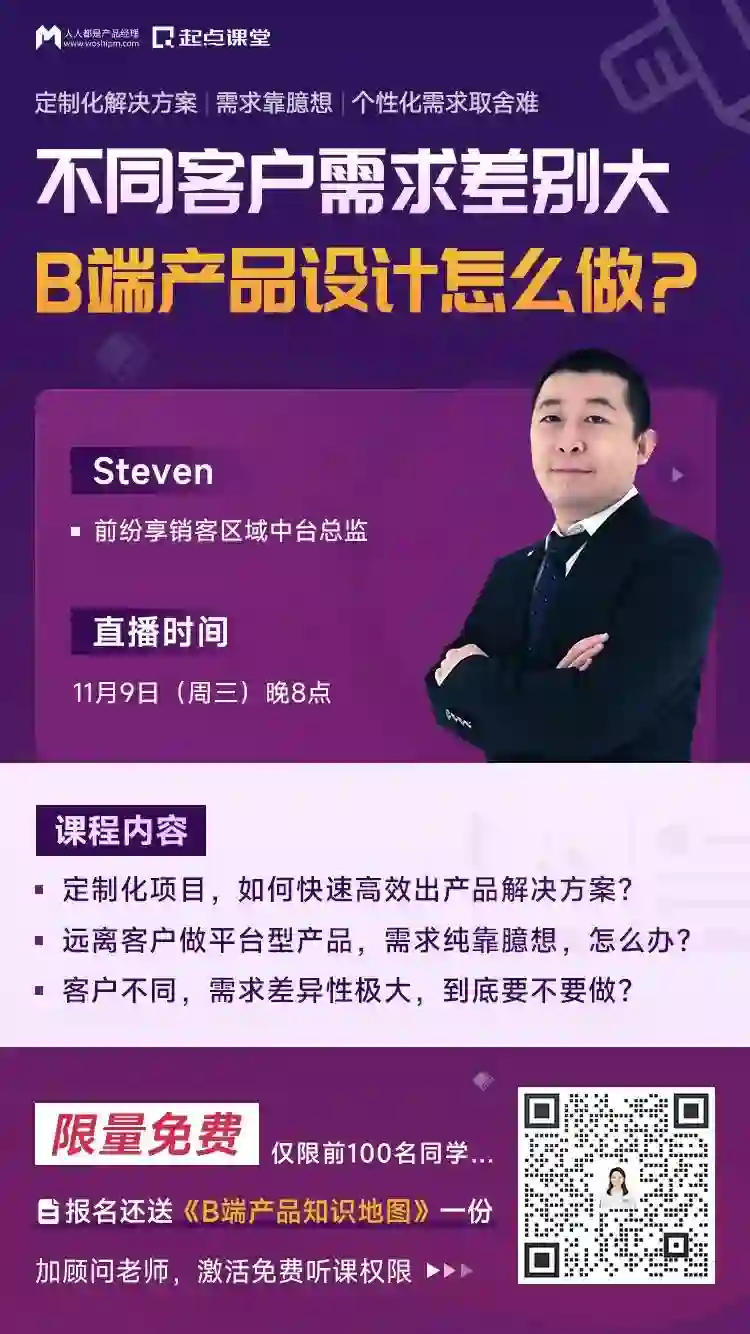 这是由起点课堂出品的B端产品公开课,专为正在做B端产品同学,或者对B端产品感兴趣想要了解相关工作内容的同学打造,课程将由前纷享销客区域中台总监@Steven老师直播授课。